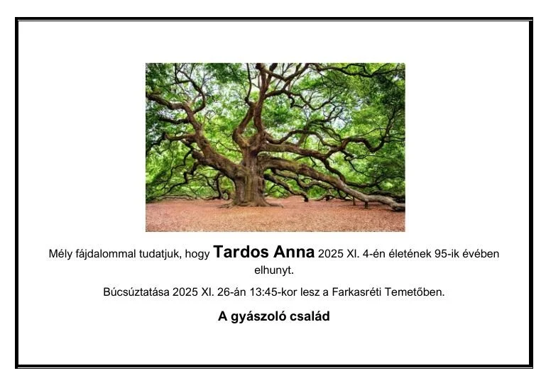 Mély szomorúsággal tudatjuk mindazokkal, akik szerették, tisztelték, barátai, tanítványai, munkatársai voltak, hogy Tardos Anna gyermekpszichológus, a Pikler pedagógia leghitelesebb képviselője, a mai napon elhunyt. Gondolatai, tanításai tovább élnek bennünk, hiánya fájó, személye pótolhatatlan.